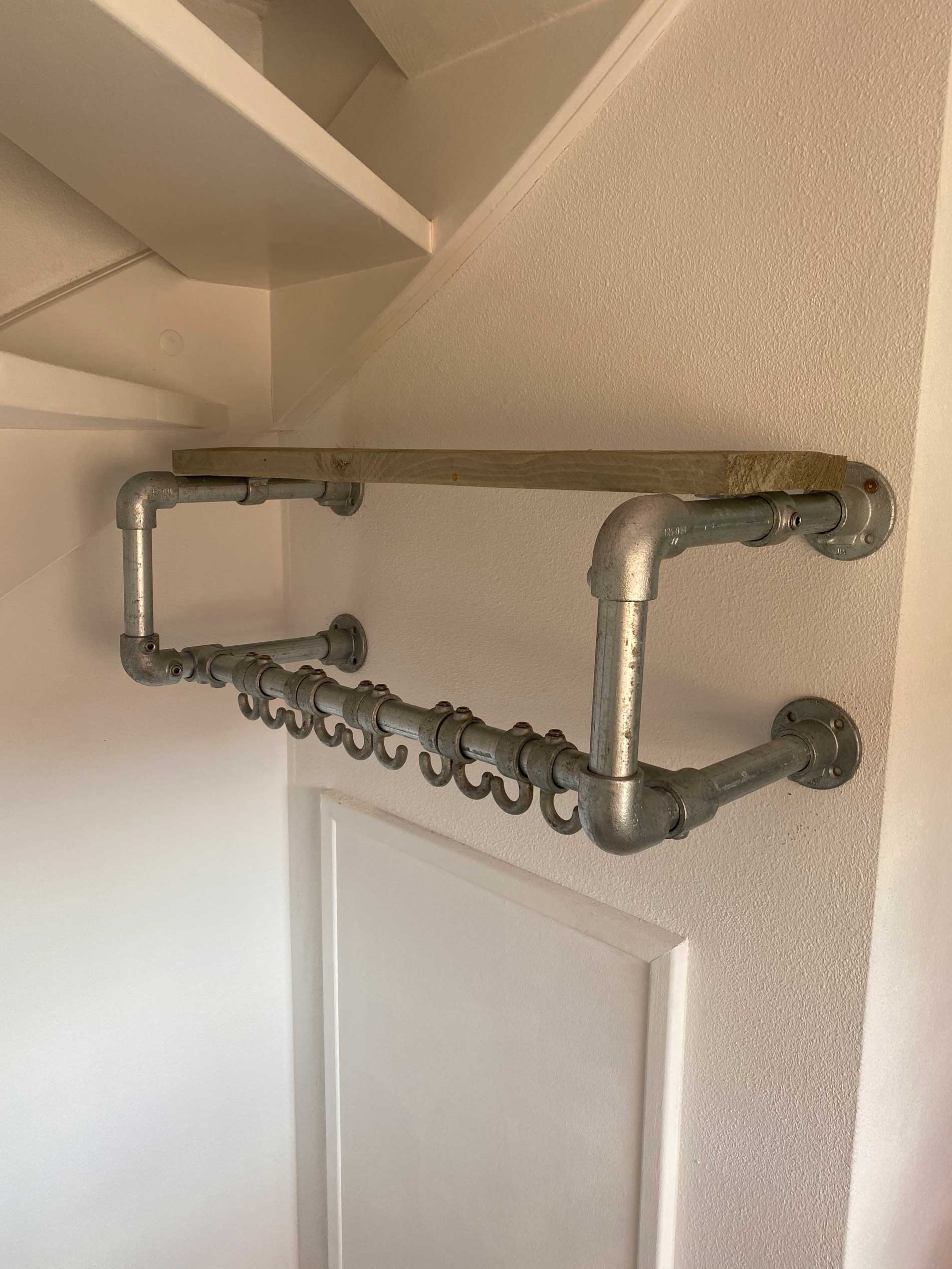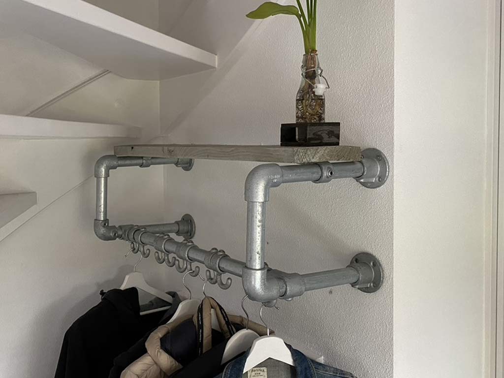 Een stoere en stevige kapstok. Gemaakt van steigerbuizen en een legplank van steigerhout.