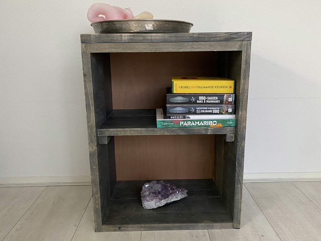 Een mooie kast van steigerhout dat kan dienen als boekenkast of als nachtkastje.