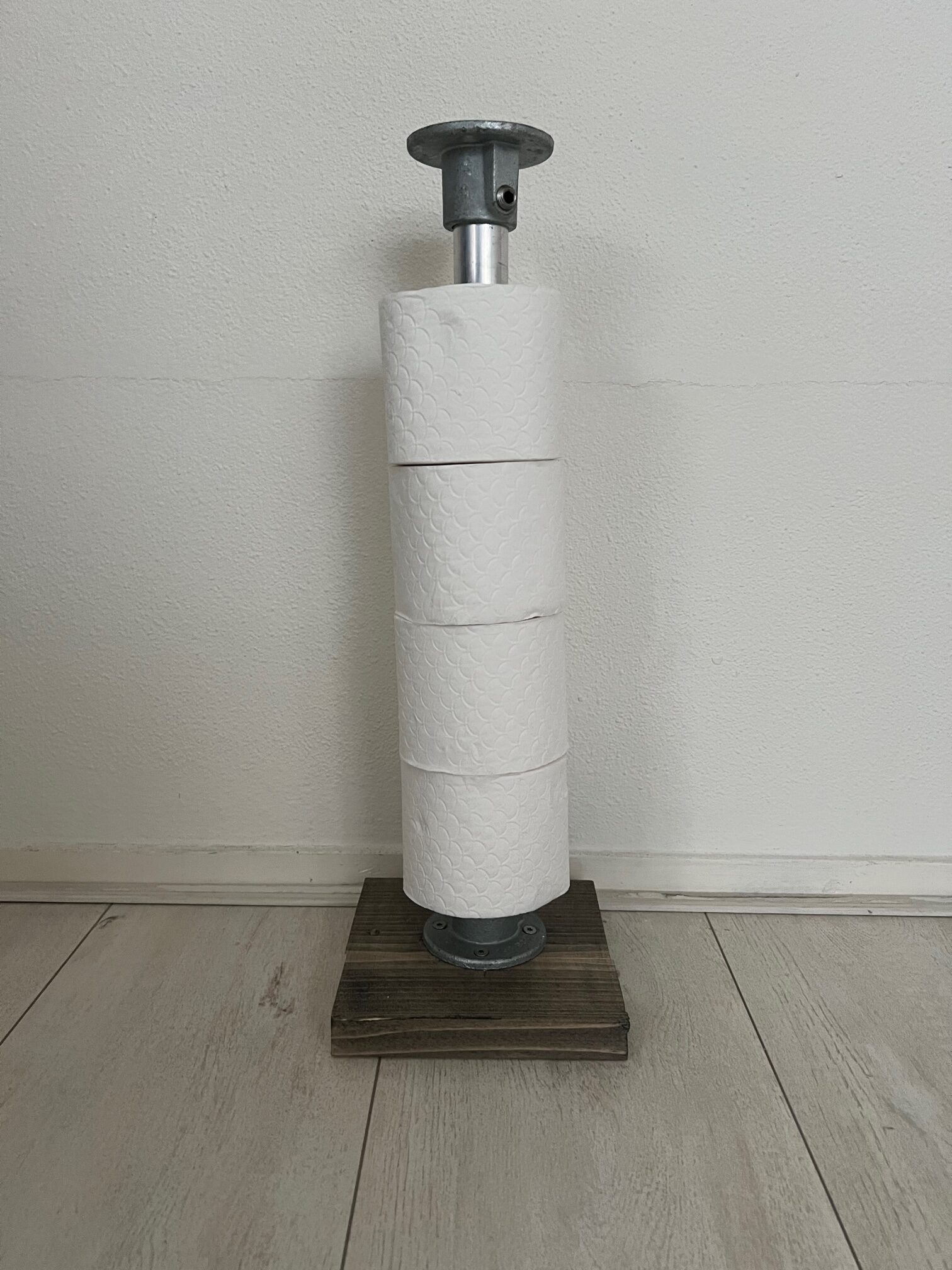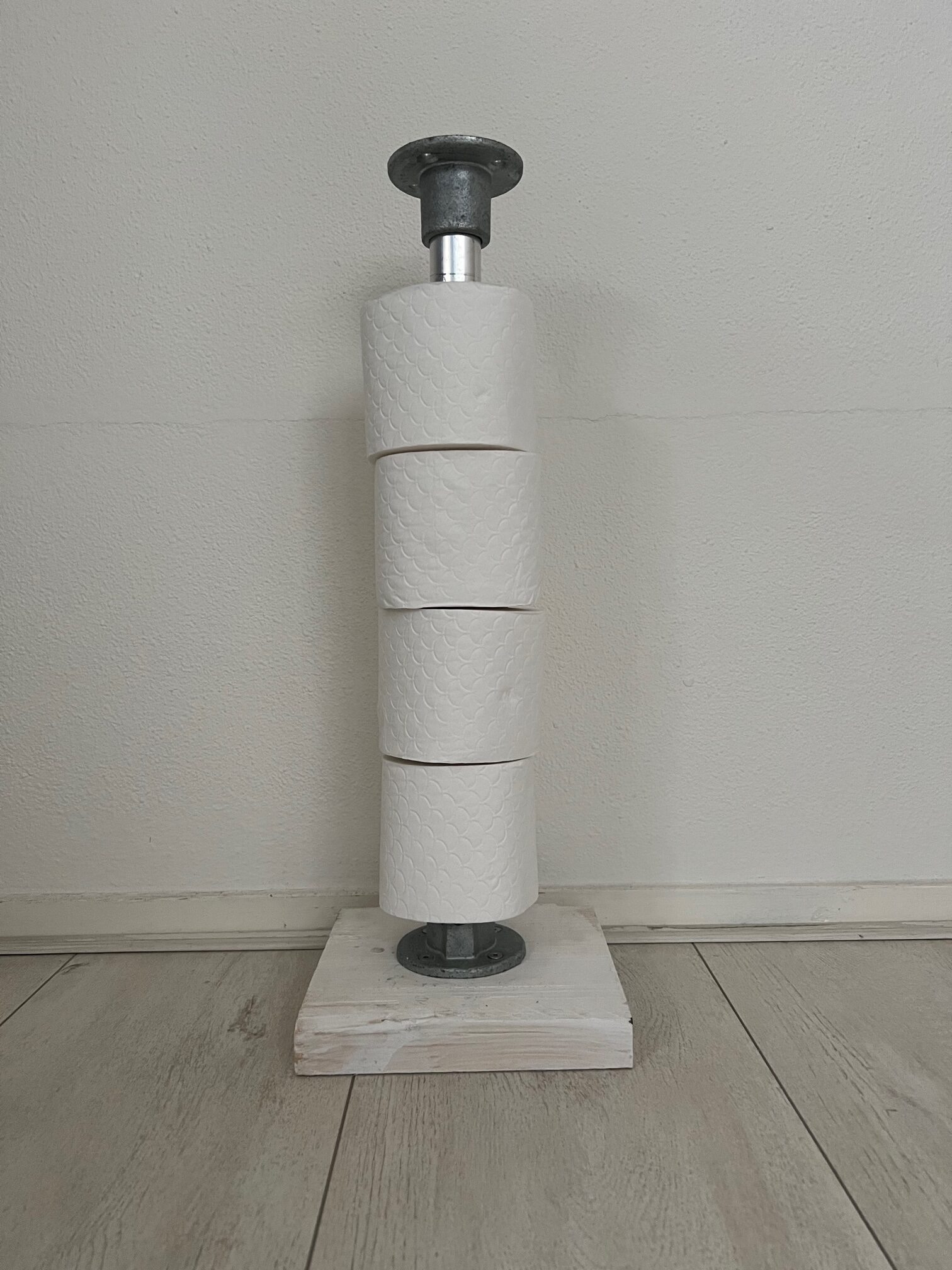 Een stoere toilet reserverolhouder van steigerhout en steigerbuis. Je kunt er 4 rollen op kwijt. In verschillende kleuren verkrijgbaar.