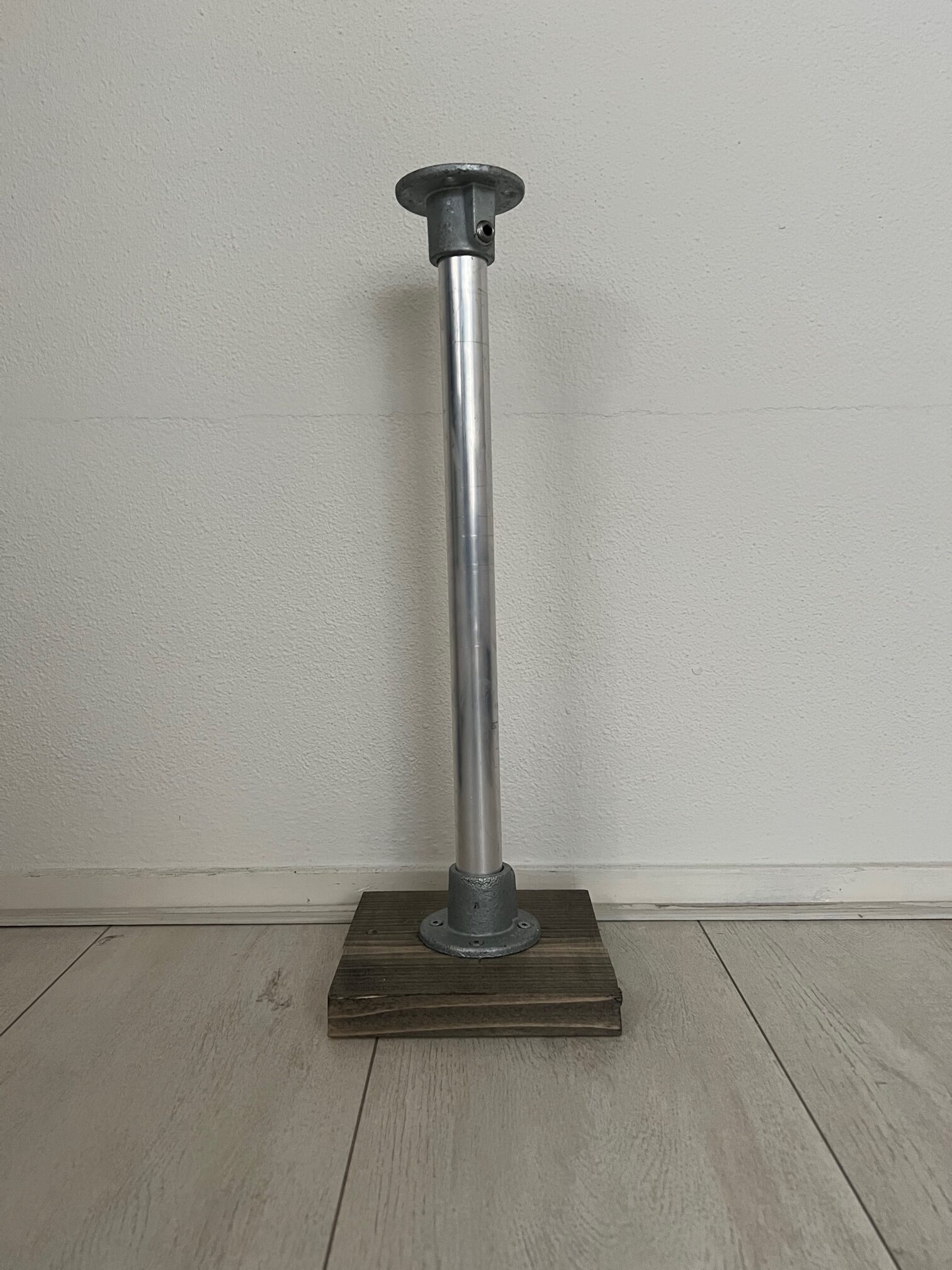 De reserverolhouder is 55 cm hoog. De afmeting van de voet is 20 bij 20 cm. De dikte van de steigerbuis is 33,4 mm.