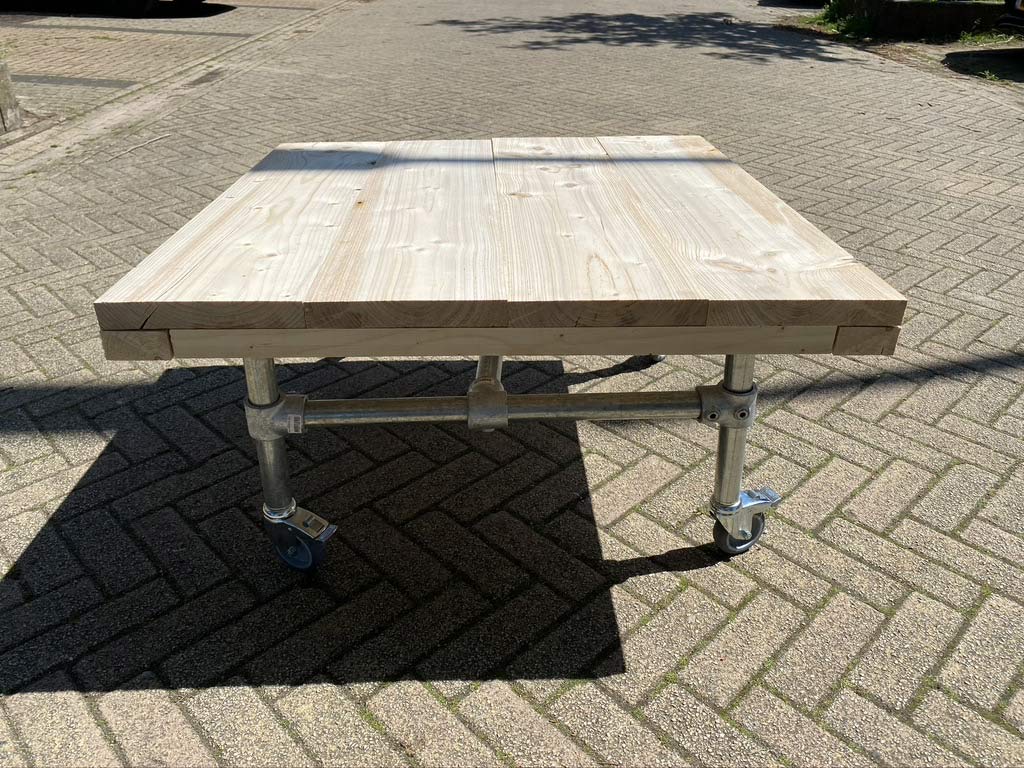 Een mooie salontafel van steigerhout en steigerbuizen. Het tafeltje kan helemaal naar eigen wens worden samengesteld. Je kunt variëren in afmetingen, kleur plank en type steigerbuis. Zo creëer je je eigen unieke tafel.
