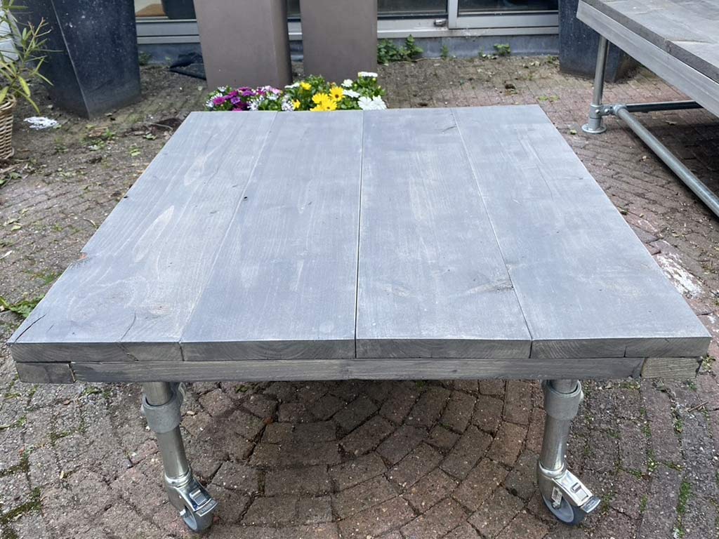 Standaard wordt de tafel geleverd met de afmetingen 80 x 80 x 40 cm en een diameter van 33,7 mm voor de steigerbuizen. Door de tafel te behandelen met een nano coating kan de tafel ook heel goed buiten worden neergezet.