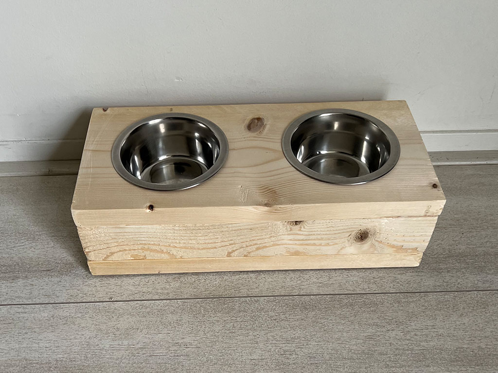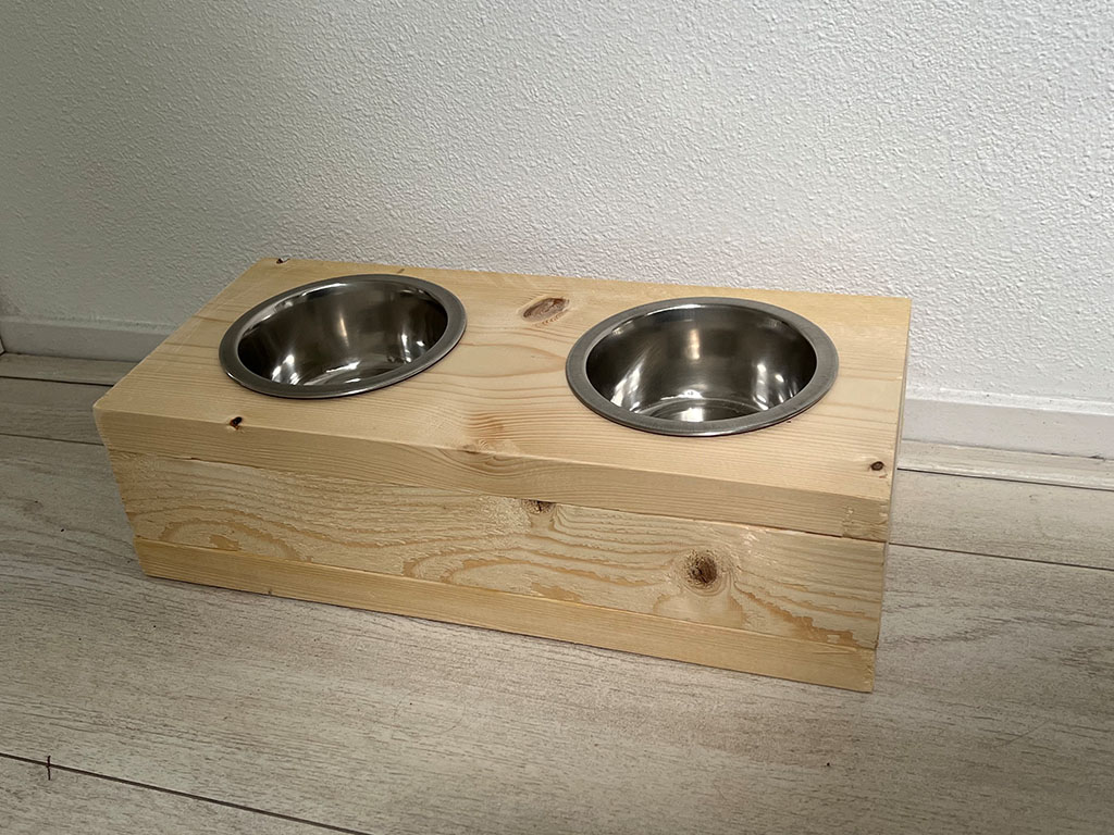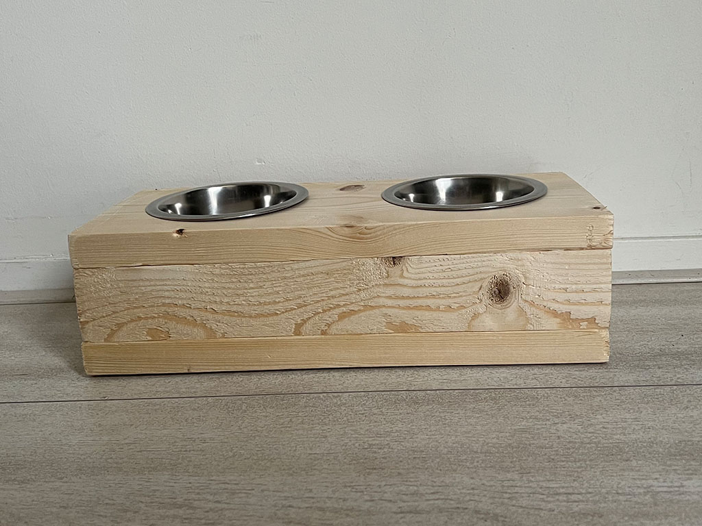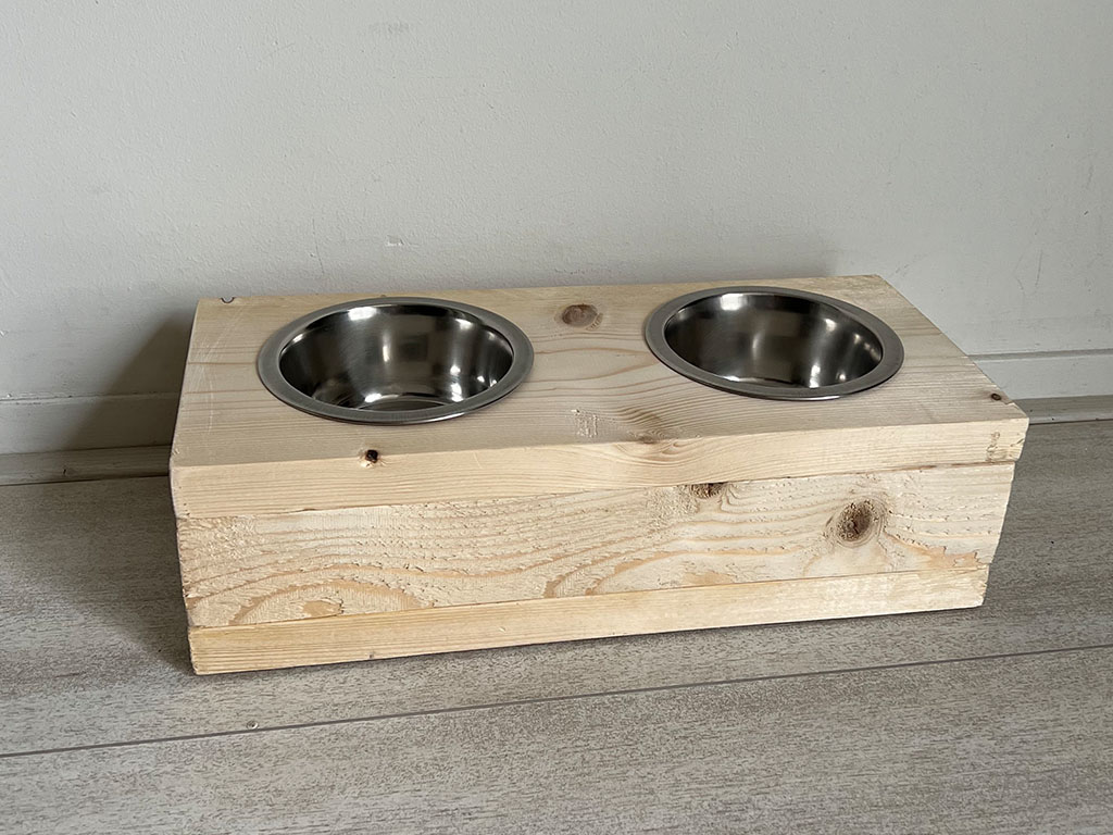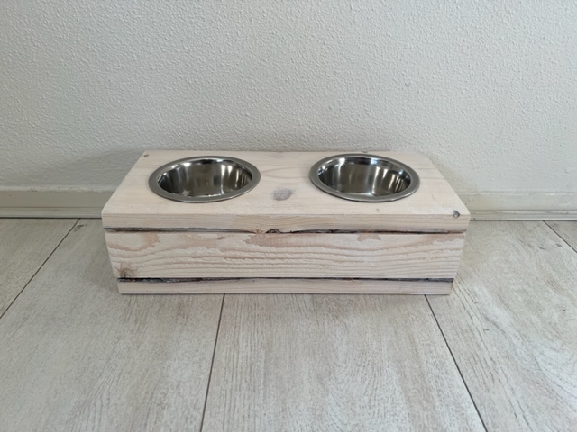Een voerbak van steigerhout voor je poes of hond. De voerbak bevat 2 bakjes van roestvrijstaal. Het hout is 2 keer geschuurd zodat je huisdier zich niet kan bezeren aan splinters. Deze uitvoering heeft 2 bakken met een diameter van 13,5 cm. Voor de wat grotere huisdieren kun je ook kiezen voor een diameter van 16,5 cm. De voerbakken zijn in verschillende kleuren te bestellen. Het hout wordt behandeld met nano-coating om het hout tegen vocht te beschermen.